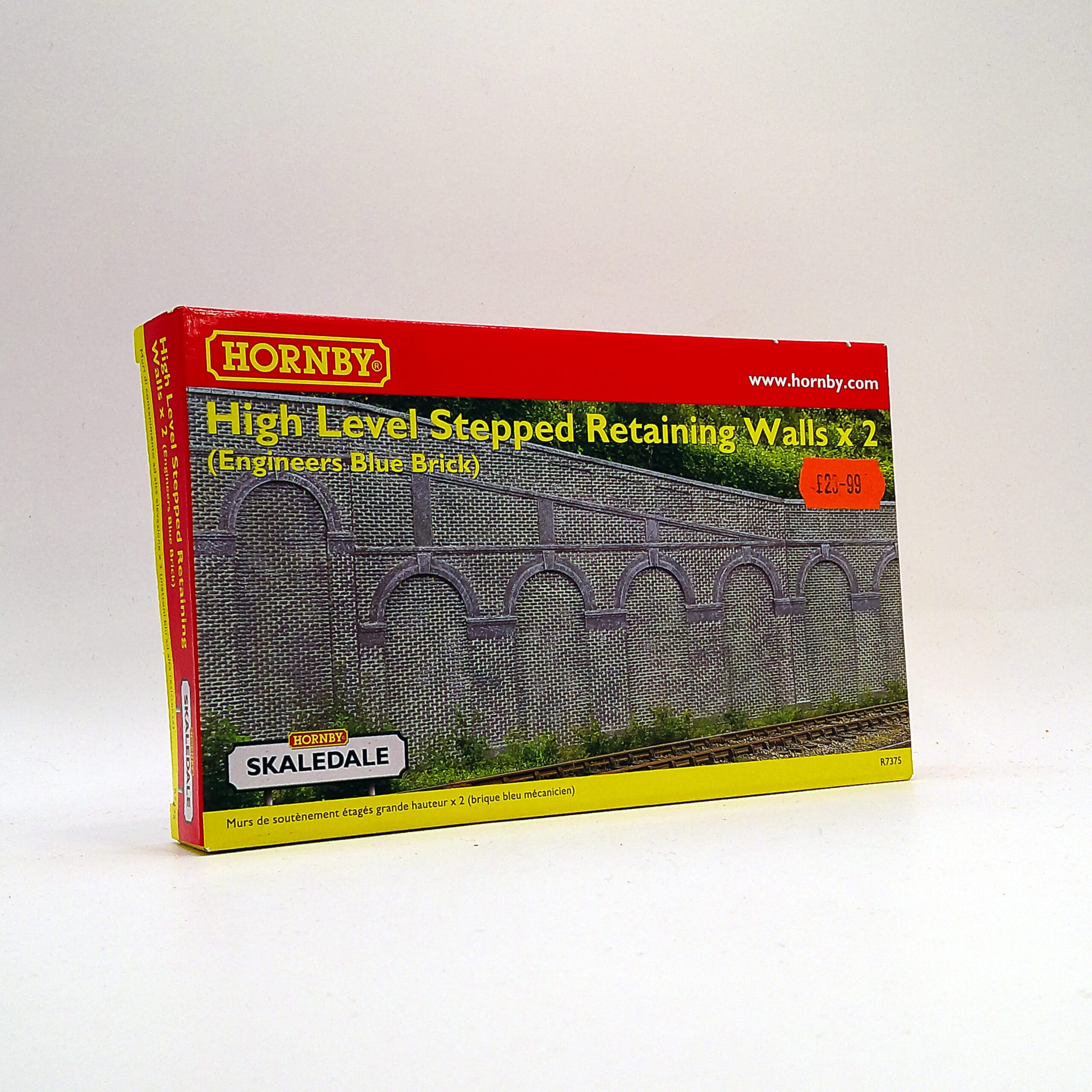 A pack of 2X scenic blue brick stepped Arched Retaining Walls as would be found lining the beginning of an embankment or railway cutting.