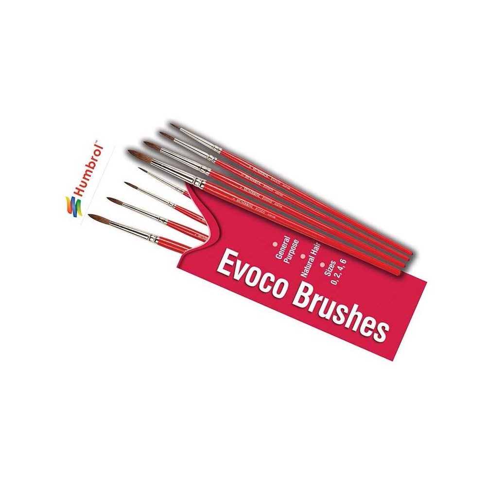Made from natural hail, Humbrol Evoco brushes are the perfect all-round brush for many model and hobby uses, keeping their shape and quality long after their first use.This pack contains size 0, 2, 4 and 6 Humbrol Evoco Brushes..