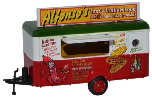 Our 12th little ‘foodie’ trailer is decorated in the Italian colour scheme of green, white and red with a specially added roof board promoting Alfonso’s Tasty Italian Food! He is doing a roaring trade in just about everything tasty from pizza and Italian sausage to fish and chips. And you can wash it all down with ‘A cool one’! The registration plate is interesting too – ALF5 P122A.