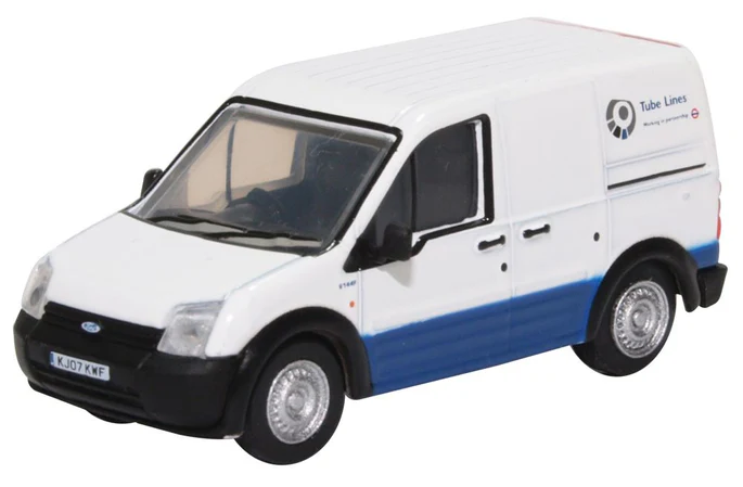 Oxford Diecast 76FTC010 Ford Transit Connect Tube Lines, The commodious modern Ford Transit Connect is the preferred light utility vehicle of many operators today, public transport related in particular where it lends itself very well as a support/service van. Here we see it as working with Tube Lines in partnership with London Transport, whose roundel appears on each side.