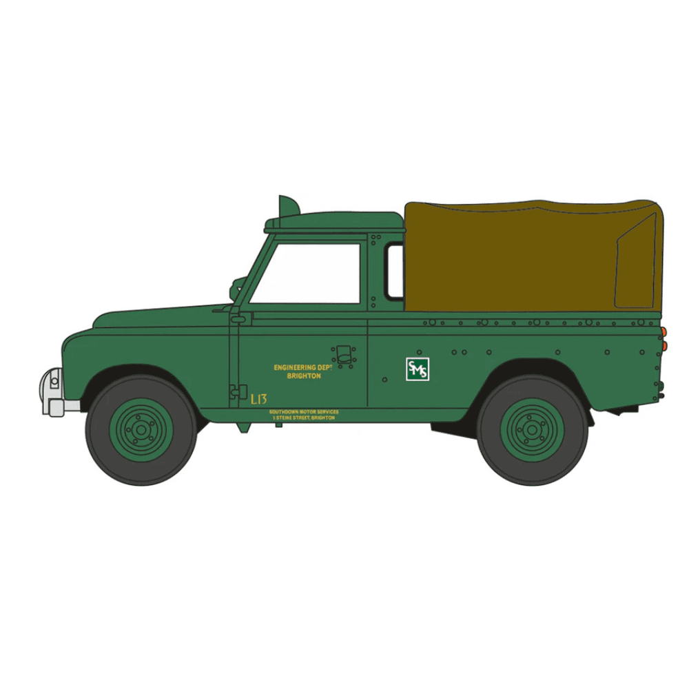 Our long wheelbase Series II Land Rover, registered 13 EUF in Southdown livery. It is decorated in a slightly more muted green colour scheme than the usual signature green, cream and gold livery of the company fleet and the address on the side indicates it works out of the Engineering Dept, as L13, Southdown Motor Services, 5 Steine Street. The canvas back is moulded in brown and the model has a black interior. Its job as a towing vehicle is verified by the red and white Towing notice on the board above the split windscreen.